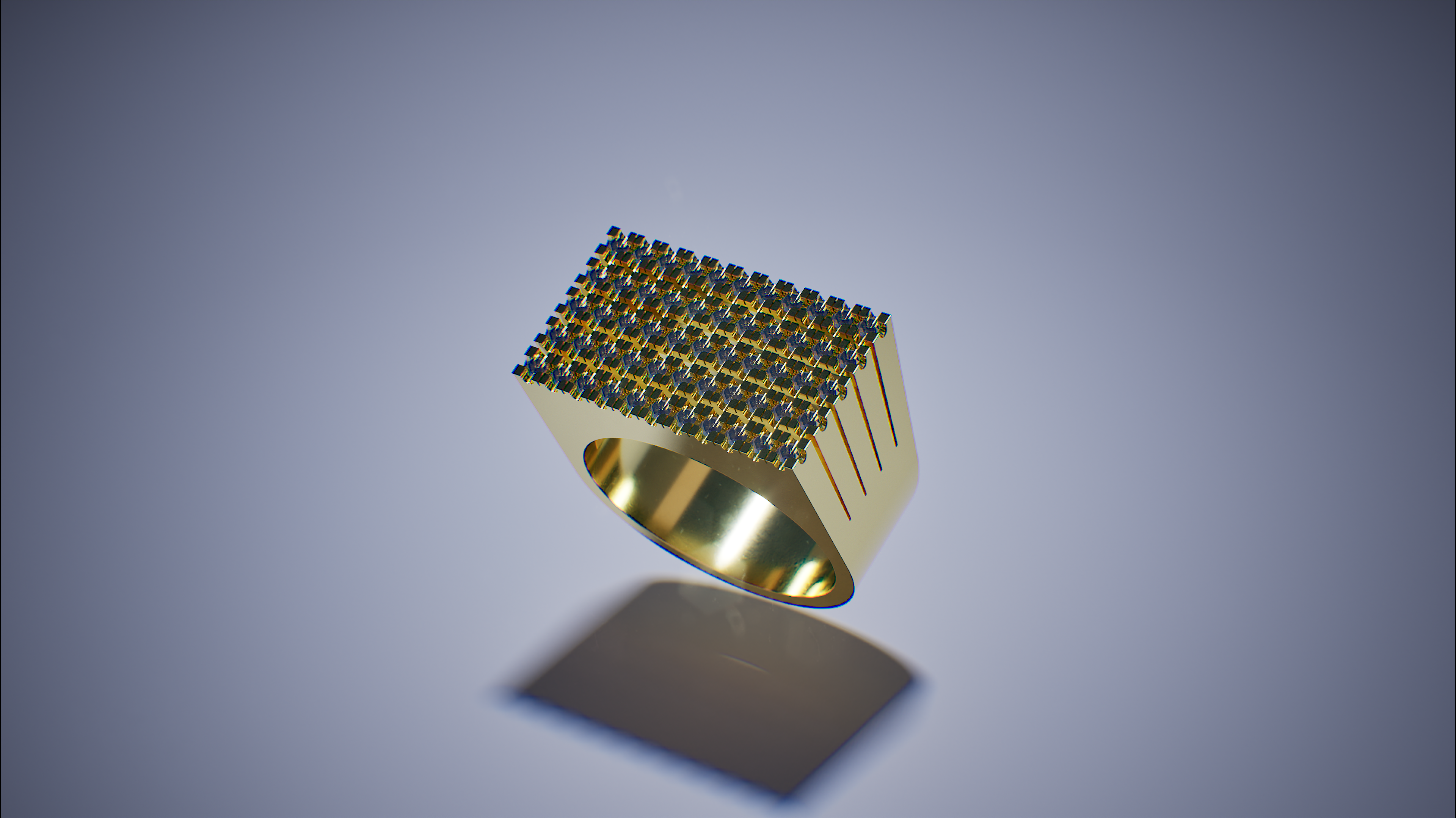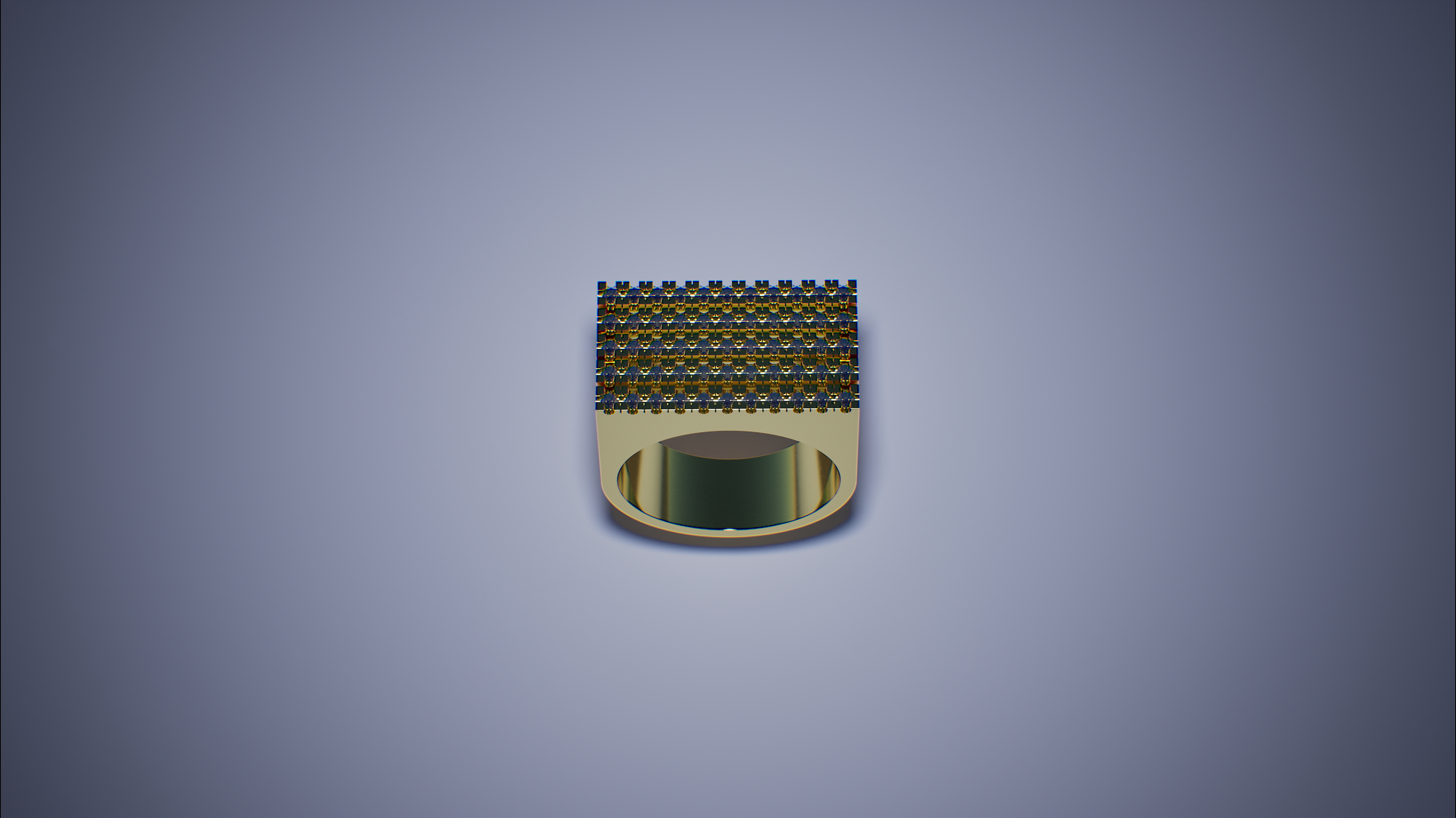 Ring modeled in Rhino 8, composed of 55 round stones set in 5 parallel rows of 11 stones each. Inspired by Art Deco style, the geometric structure features an angular band with flat surfaces. The regular setting emphasizes repetition and symmetry, creating a clean and graphic look.